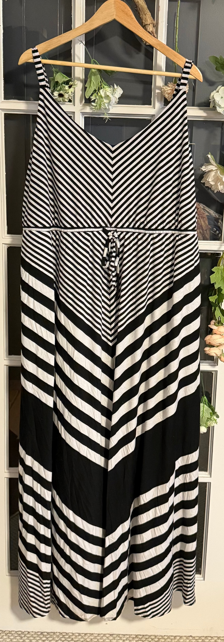 Step into effortless style with this Torrid black and white striped maxi dress, featuring a playful waist tie that lets you customize your silhouette. Its bold chevron print adds a fun twist to classic stripes, making it a perfect go-to for casual days or relaxed evenings. Soft, flowing fabric ensures comfort as you move through your day with ease. Ideal for those who love a mix of comfort and charm, this dress is a standout piece from Mustang Sally Two's closet. Grab it while you can—FINAL SALE.