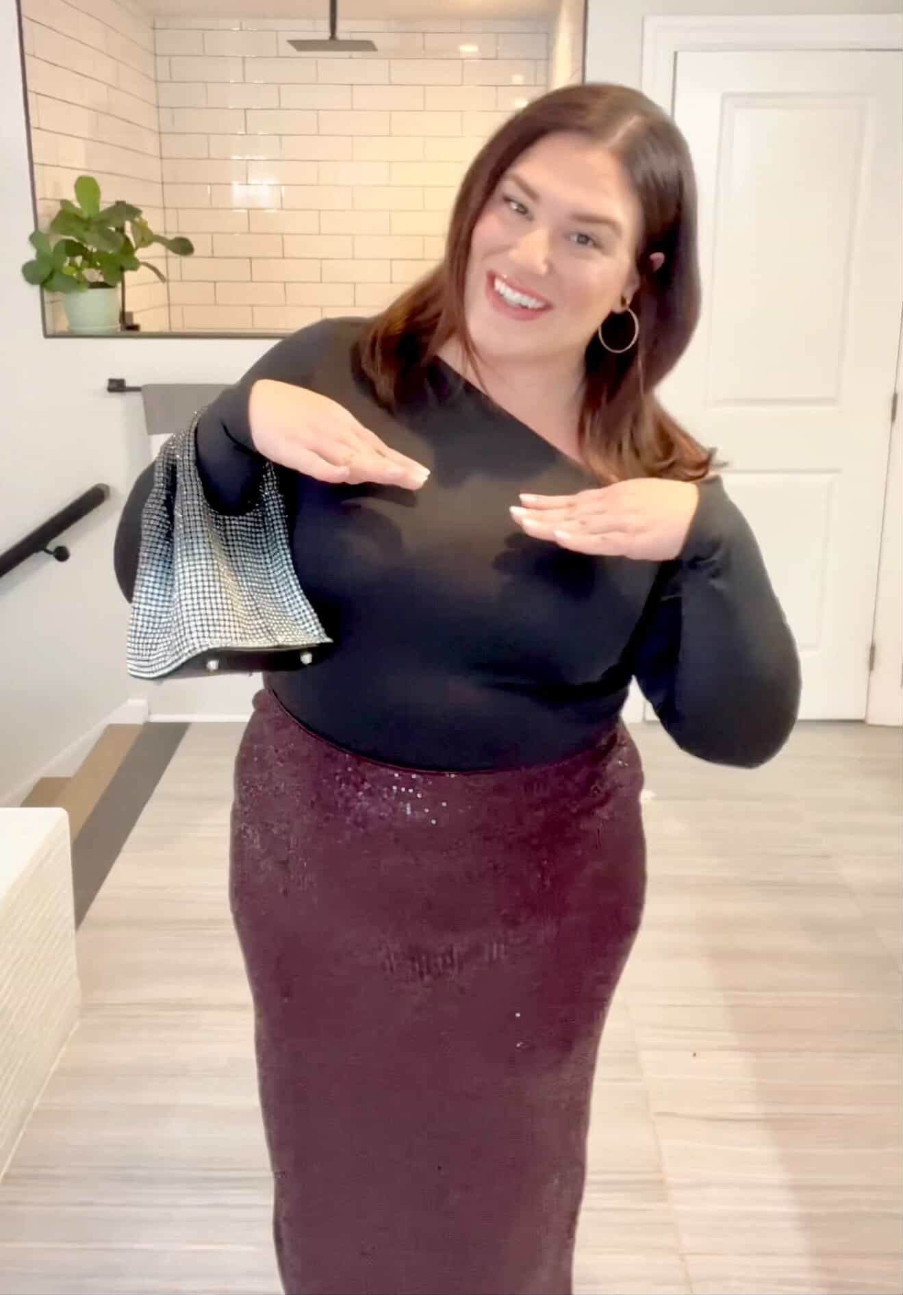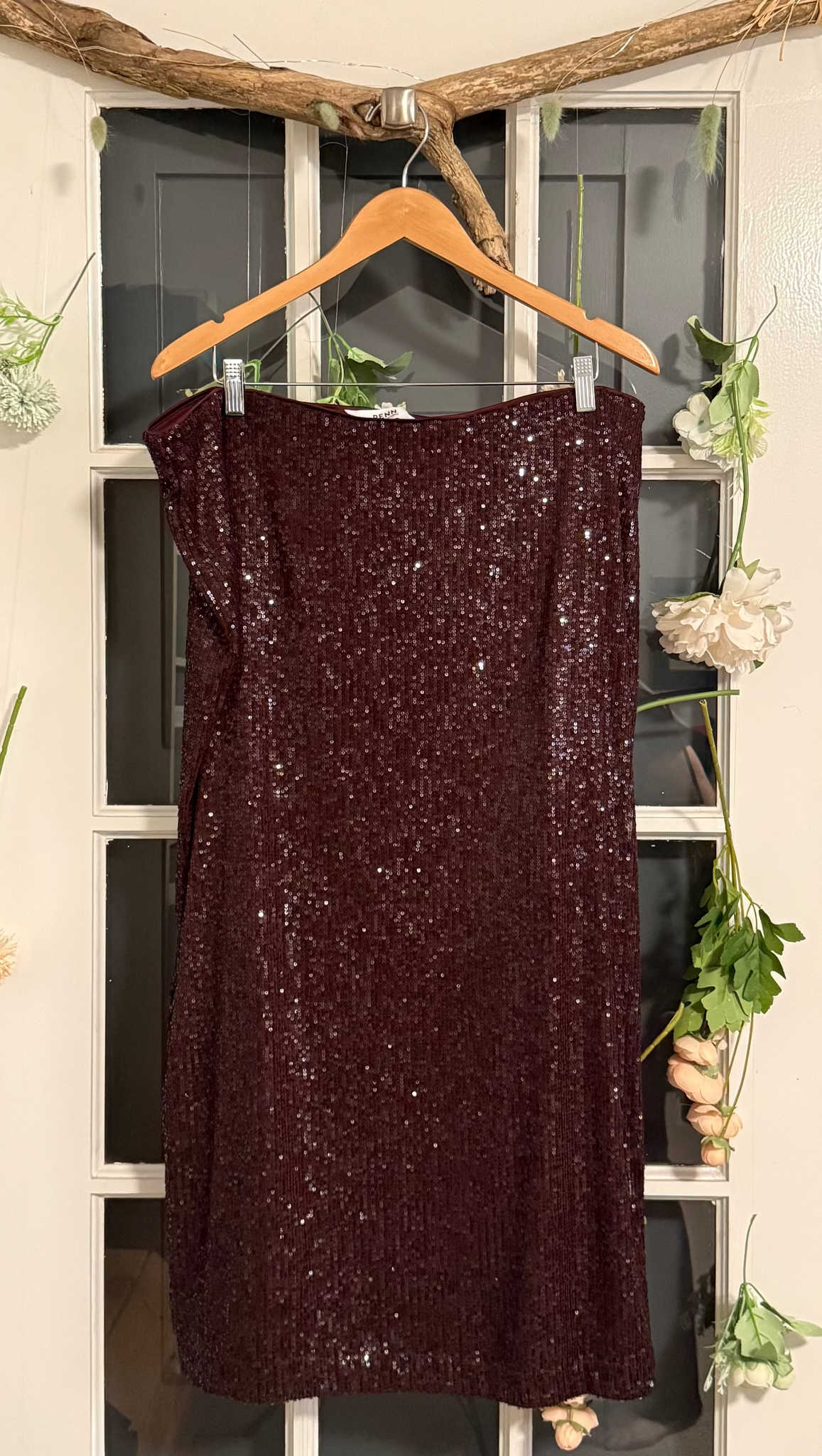 Shimmer and shine in this stunning maroon sequin skirt from the @lovezoepotter collection. Perfect for turning heads at holiday parties, nights out, or whenever you want to add some sparkle to your wardrobe. The rich maroon hue pairs beautifully with everything. Final sale.