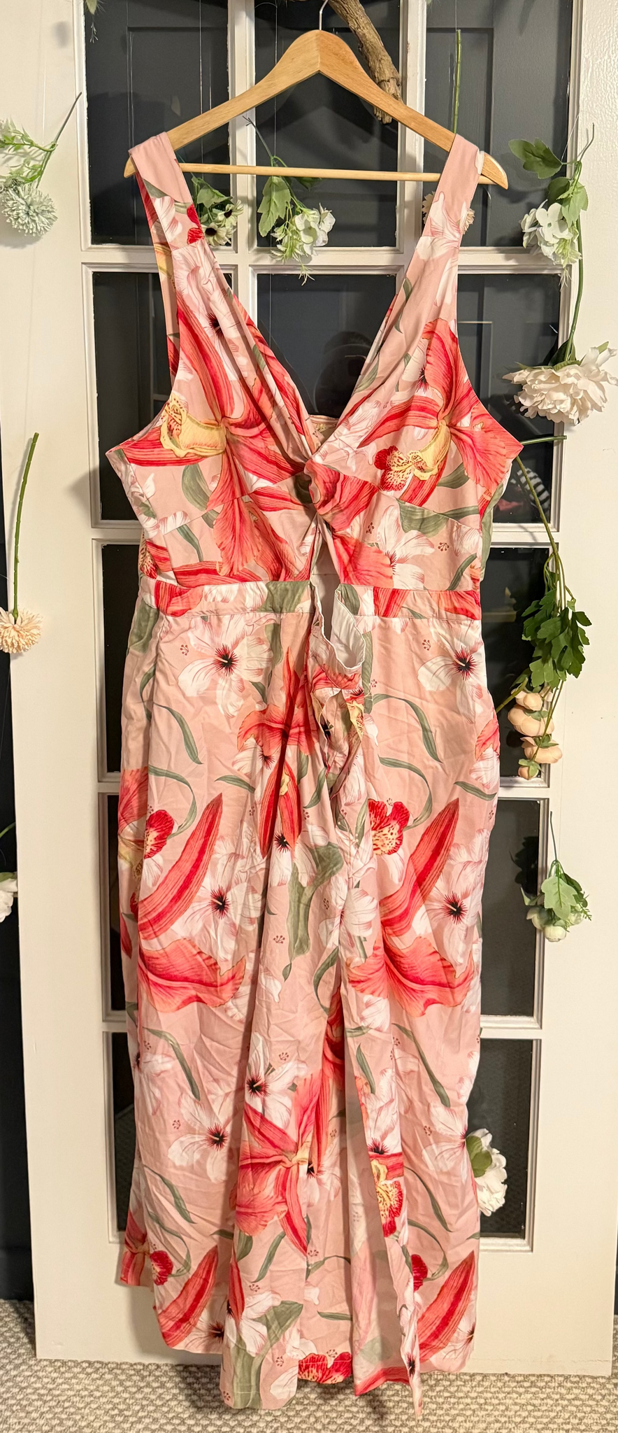 Add some zest to your wardrobe with this playful Peach and Coral Floral Jumpsuit, featuring a flirty front centre cutout and a charming skirt overlay. Custom sized 26/28 and lovingly sourced from Mustang Sally Two's closet, this jumpsuit combines comfort with a splash of vibrant colour. Whether you're heading to brunch or dancing the night away, its breezy fit and eye-catching floral pattern make it a perfect choice for showcasing your fun, confident style. Embrace the joy of dressing up with this unique and flattering piece! FINAL SALE.