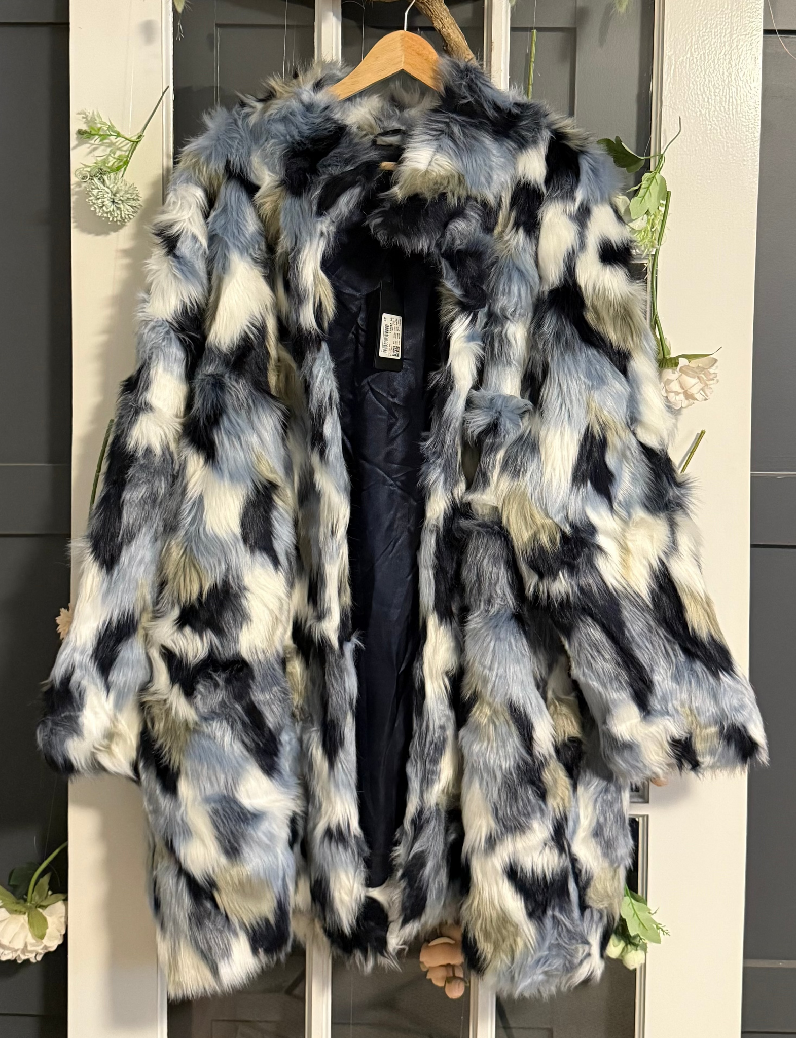 • Load image into Gallery viewer, Ulla Popken faux fur blue print coat 28/30
