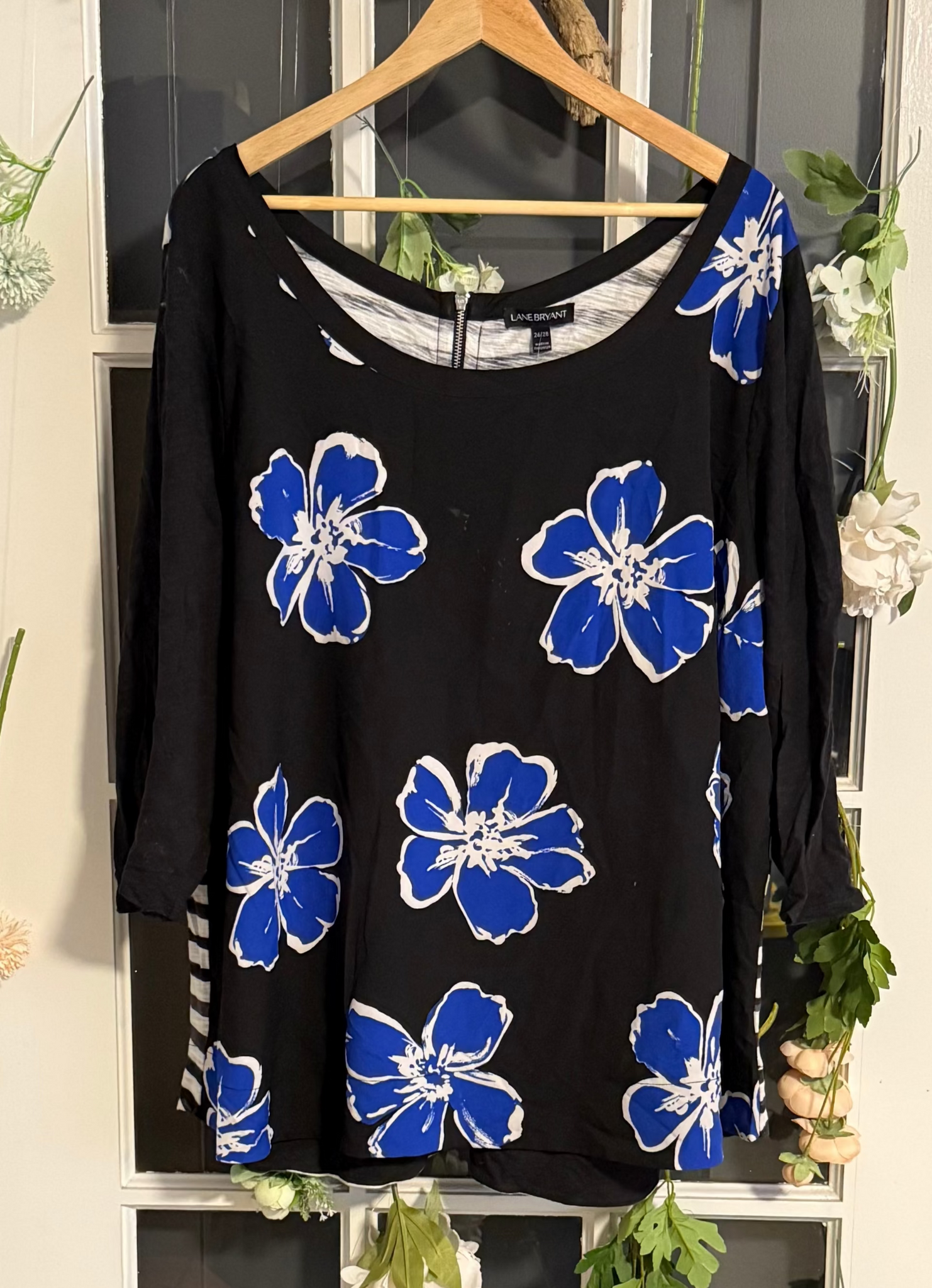 Bring a splash of bold elegance to your wardrobe with this Lane Bryant black and blue floral blouse. From Mustang Sally Two’s closet, it blends vibrant florals with a flattering fit, perfect for adding a playful and stylish touch to any outfit. Whether dressing up for a night out or keeping it casual, this blouse promises comfort and confidence in every wear. FINAL SALE.